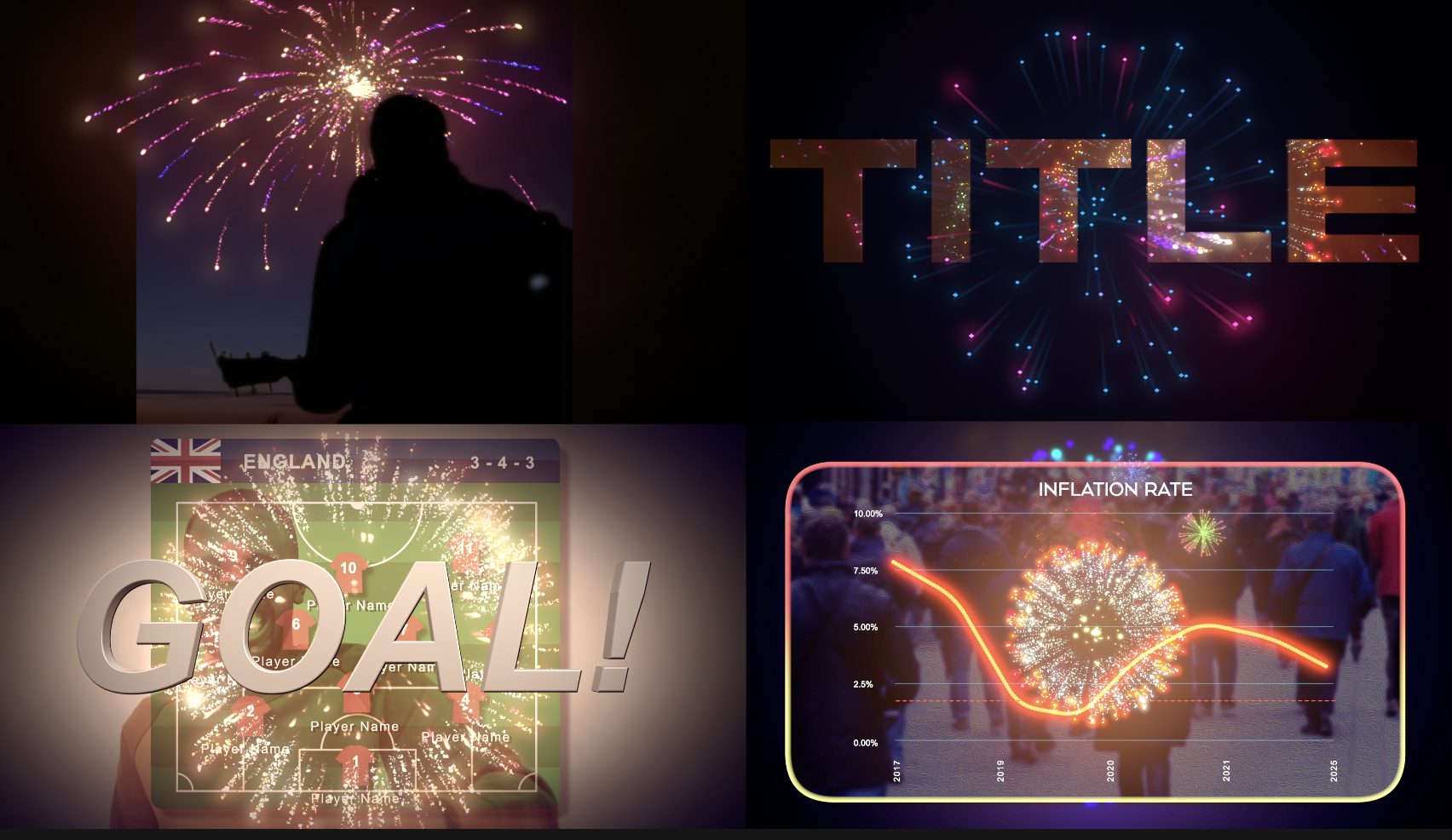 These firework effects are designed for maximum utility across any project type, as proven by their use in graphics, sports scoring, and title sequences: